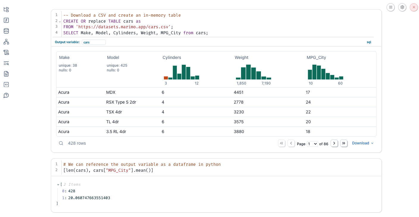 marimo lets you can mix and match Python and SQL: Use SQL to query Python dataframes (or databases like SQLite and Postgres), and get the query result back as a Python dataframe.